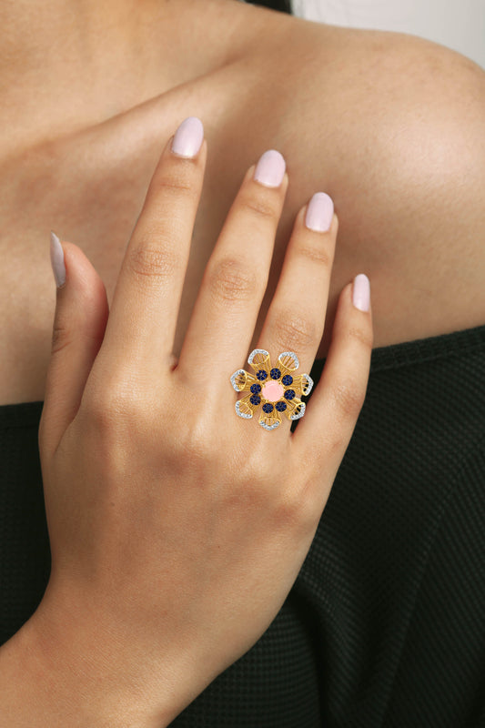 Amrita 18k Yellow Gold Pink and Blue Stone Studded Flower Bouquet Ring with Dazzling Zirconia
