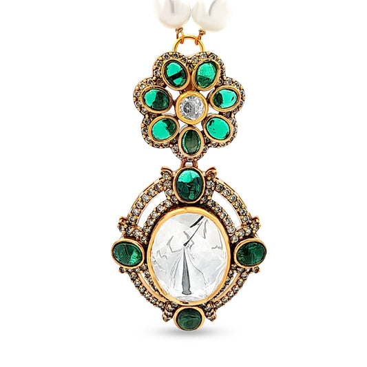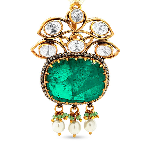 Keerthi's 925 Silver kundan Pendant with Green Stone and Pearl Hangings