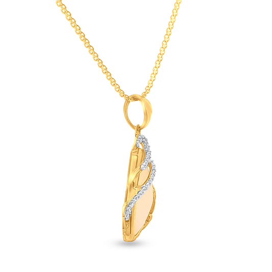 पुष्पन्ना: 22K पीले सोने का गुलाबी पत्थर का पेंडेंट जिसमें पत्तों की नक्काशी और हीरे जड़े हैं